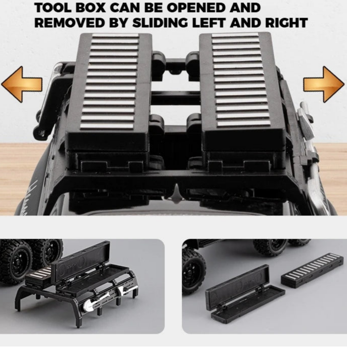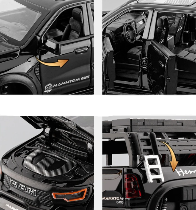 Our Ram Hennessey Mammoth 1000 TRX 6x6 models takes pickup truck power and presence to an entirely new level. Built on the already insane Ram TRX platform, the Hennessey Mammoth transforms it into a six-wheeled beast unlike anything else on the road. More special and more extreme than any other pickup, this is the one you want if you crave size, strength, and exclusivity. The model comes loaded with accessories, including a toolbox, retractable hook, spare wheel holder, and more — capturing every rugged detail of this outrageous truck in collectible form.